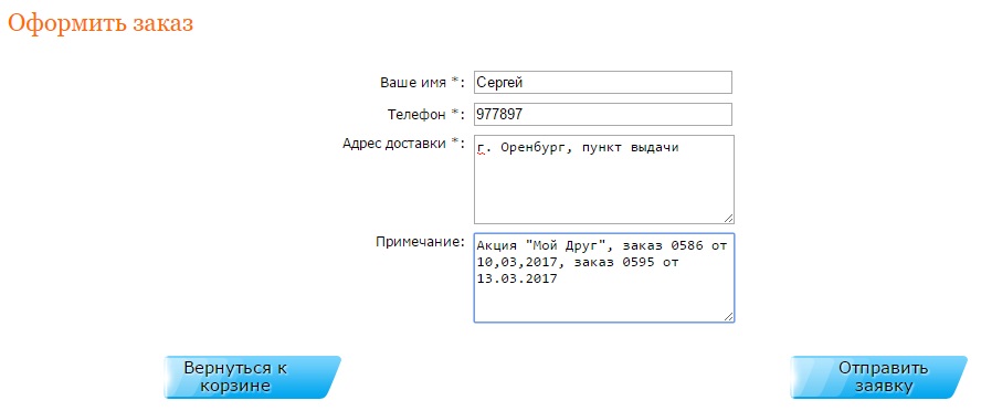 - Указываем Ваше имя, Тел, Адрес получения, в Примечании указываем, заказы ваших друзей, и нажимаем отправить заявку