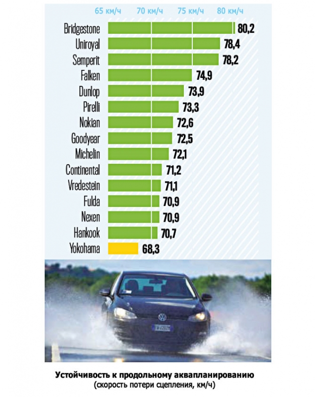 Бесспорным лидером данного испытания выступила Turanza T001, сумев продемонстрировать скорость 80,2 км/ч на мокрой дороге. Второе и третье место в данном испытании достались Uniroyal RainSport 3 и Semperit Speed-Life 2. Их результат – 78,4 и 78,2 км/ч соответственно. Последней, с отрывом в -10 км/ч стала Yokohama AE-50 BluEarth-A.