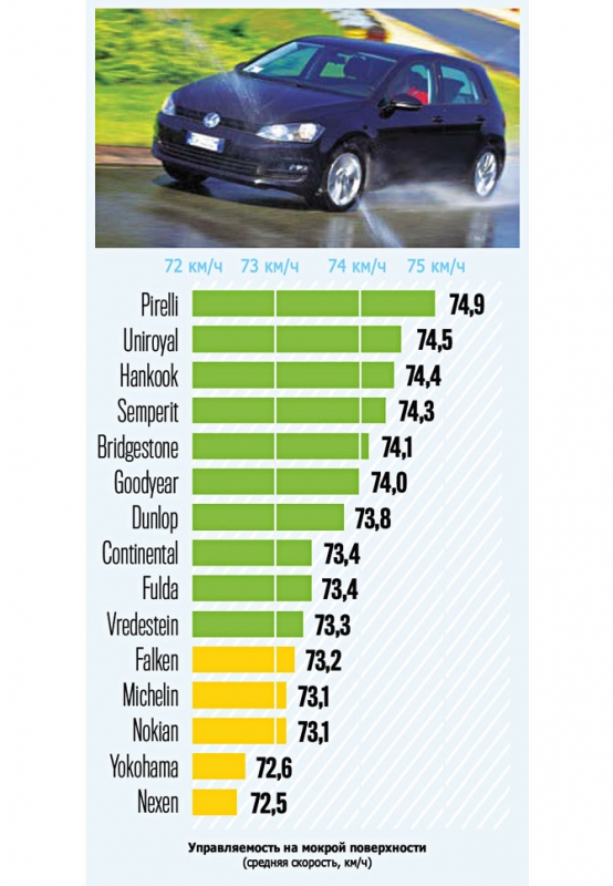 Лидерами в этом испытании стали Uniroyal и Semperit, переместившиеся на 1 и 2 место, соответственно. Модели, принадлежащие немецкому концерну Continental, во второй раз продемонстрировали высокий результат на мокрой трассе. Разрыв между ними снова оказался незначительным.