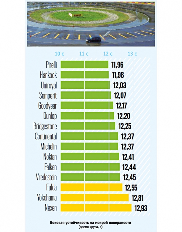 Испытание на круге не привнесло каких-то новых открытий. Четверка лидеров такая же, как и в испытании на управляемость. Uniroyal поменялась местами с Hankook, восстановив изначальную пару с Semperit. Время, за которое был пройден круг, 11,96 с у Pirelli и 12,07 с у Semperit.