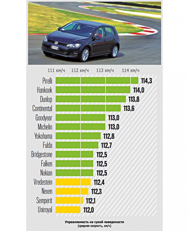 Лучшую управляемость на сухой дороге показал недавний лидер испытаний на мокрой дороге Pirelli с результатом 114,3 км/ч. Следом за ней Hankook (114 км/ч). Хороший результат у Dunlop Sport BluResponse (113,8 км/ч) и Continental PremiumContact 5 (113,6 км/ч). Чего не скажешь о Semperit и Uniroyal, которые в данном испытании по результатам оказались худшими – 112,1 и 112 км/ч.