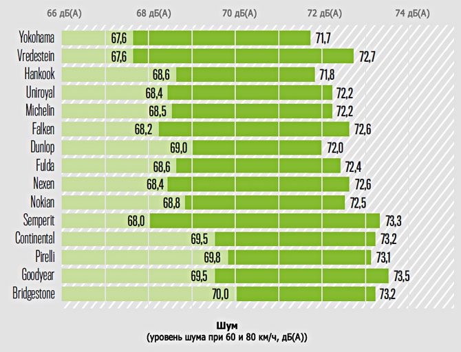 Уровень шума измеряли на двух скоростях – 60 и 80 км/ч. Удивила своими достижениями Yokohama и Vredestein Sportrac 5. Наивысшую шумность продемонстрировали Bridgestone и Goodyear EfficientGrip Performance.