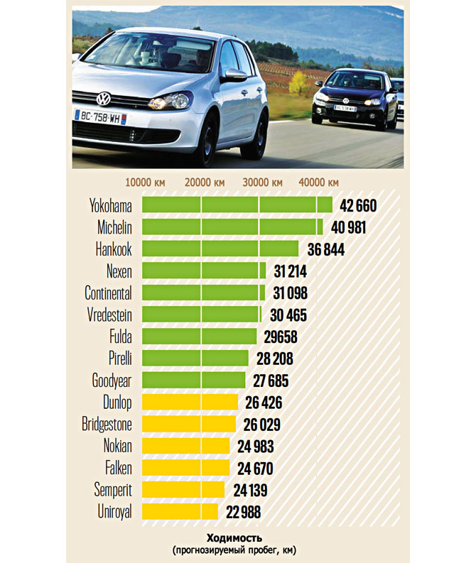 Какой смысл покупать шины с лучшими ездовыми качествами, если через несколько тысяч километров от них ничего не останется? Чтобы определить ресурс шин, был проведен специальный тест, во время которого на них проехали по 10 000 км по обычным дорогам, после чего при помощи лазера измерили остаточную глубину протектора и рассчитали потенциальный максимальный пробег - до момента когда глубина основных канавок снизится до 1,6 мм. Провести испытания доверили специалистам DEKRA. Самыми долговечными неожиданно оказались Yokohama, за которыми следуют Michelin.