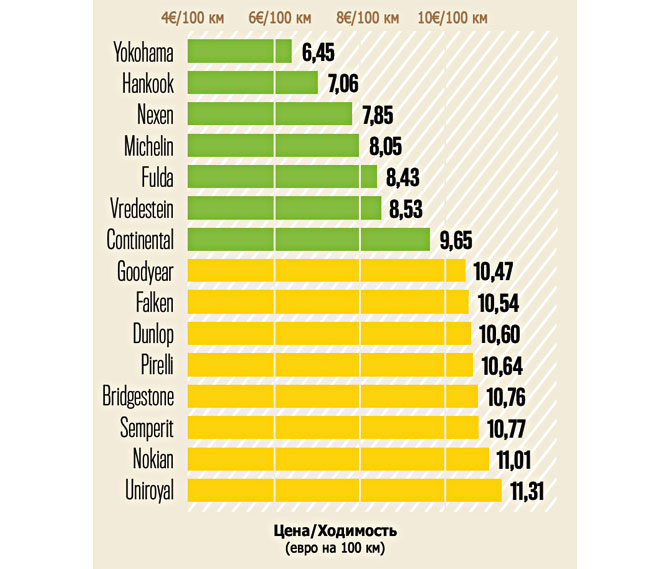 Цель данного испытания – определить выгоду от приобретения шины, основываясь только на двух показателях – стоимости модели в евро и максимальном пробеге за период эксплуатации. Самым выгодным приобретением для потребителей оказались покрышки Yokohama, за которые придется выкладывать по 6,45 за каждые 100 км пути. Свыше 11 евро обойдутся автолюбителям Nokian и Uniroyal.